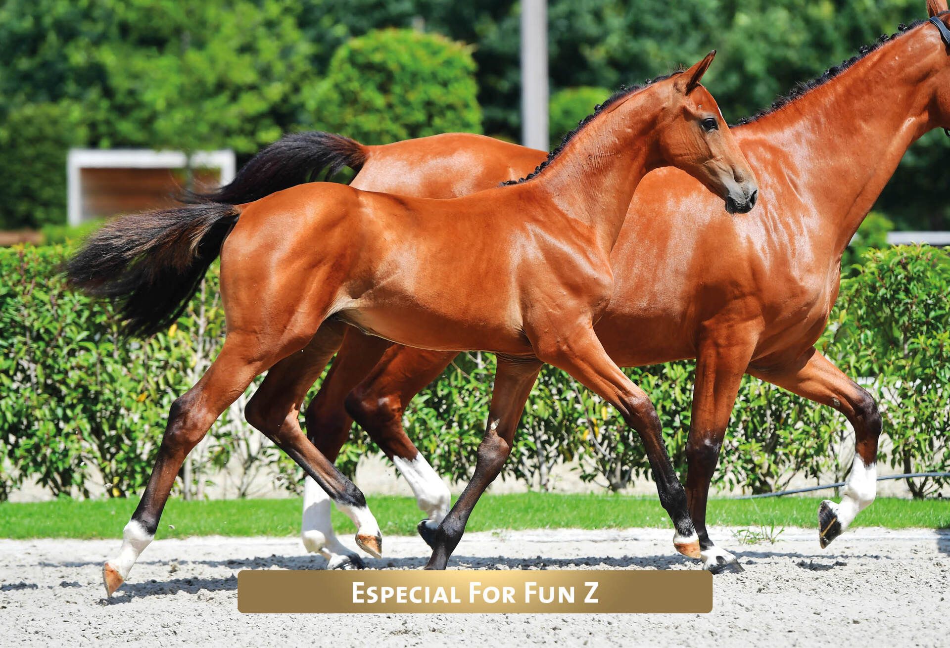 Das ganz Besondere an Especial For Fun Z ist, neben seiner ganz tollen Persönlichkeit, die Passer-Anpaarung Eldorado vd Zeshoek mal For Pleasure, wie bei Killer Queen, der aktuellen Aachen-Siegerin unter Daniel Deußer, und bei Elektric Blue P, unter Max Kühner 2021 Sieger im Großen Preis von `s Hertogenbosch.